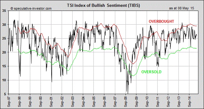 Major / Medium-Term Stock Market Indicator: TSI Index of Bullish Sentiment (TIBS) TIBS is an amalgamation of a number of different sentiment indicators. The components of TIBS were selected by graphing a large number of sentiment indicators against the S&P500 over several years. The 6 indicators that predicted the market's important turning points with the greatest reliability were then chosen and used in a calculation to determine an objective overall measure of bullish sentiment (a contrary indicator). TIBS is calculated weekly and is an integral part of our market analysis. |